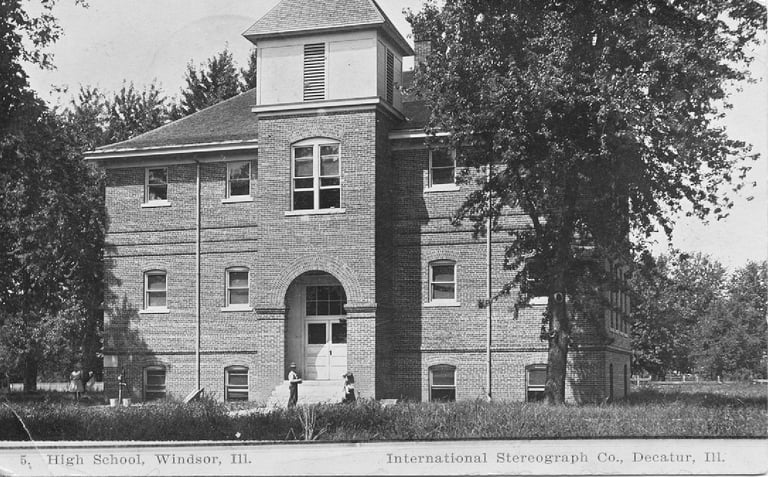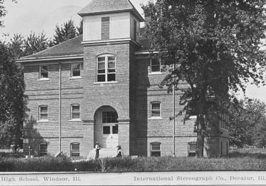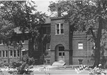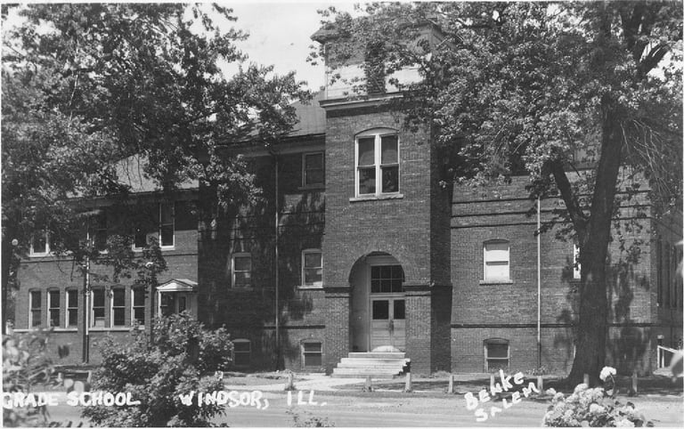 This is a post card picture of the Windsor Grade School in about 1949. The cafeteria was located in the basement and lead directly to the gym by going up a few stairs. The Windsor Community High School was organized in 1921 in this building and continued until the new high school was build.